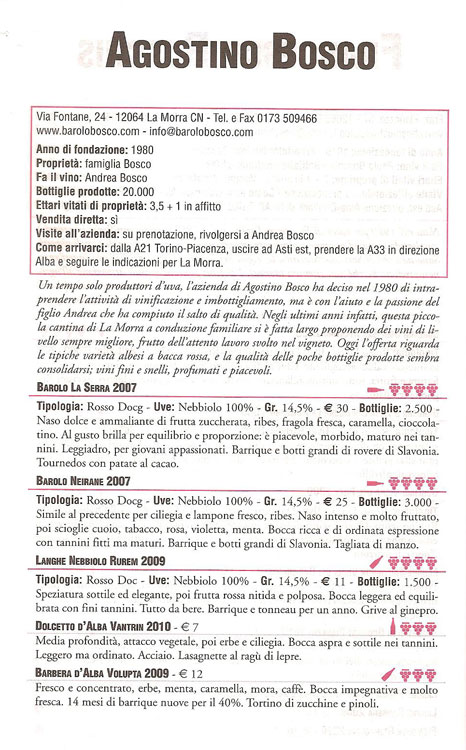 Un tempo solo produttori d'uva, l'azienda di Agostino Bosco ha deciso nel 1980 di intraprendere l'attività di vinificazione e imbottigliamento, ma è con l'aiuto e la passione del figlio Andrea che ha compiuto il salto di qualità. Negli ultimi anni infatti, questa piccla cantina di La Morra a conduzione familiare si è fatta largo proponendo dei vini di livello sempre migliore, frutto dell'attento lavoro svolto nel vigneto. Oggi l'offerta riguarda le tipiche varietà albesi a bacca rossa e la qualità delle poche bottiglie prodotte sembra consolidarsi; vini fini e snelli, profumati e piacevoli. |