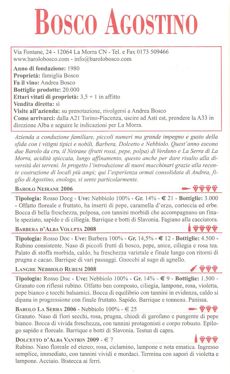 Azienda a conduzione familiare, piccoli numeri ma grande impegno e gusto della sfida con i vitigni tipici e nobili, Barbera, Dolcetto e Nebbiolo. Quest'anno escono due Barolo da cru, il Neirane (Frutti rossi, pepe, polpa) di Verduno e La Serra di La Morra, acidità spiccata, lungo affinamento, questo anche per dare risalto alla diversità dei terreni. In progetto l'introduzione di nuovi macchinari grazie alla recente costruzione di locali più ampi; qui l'esperienza ormai consolidata di Andrea, figlio di Agostino, enologo, si sente particolarmente.