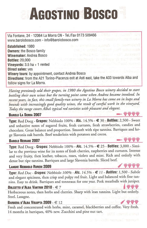 Having previously sold their grapes, in 1980 the Agostino Bosco winery decided to start bottling their own wines but the turning point came when Andrea became involved. In recent years, in fact, this small family-run winery in La Morra has come on in leaps and bounds with increasingly good quality wines, the result go careful work in the vineyard. Today the range covers Alba's typical red varieties with pleasant and elegant. |