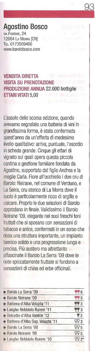 | L'assolo della scorsa edizione, quando avevamo segnalato una batteria di vini in grandissima forma, è stata confermata quest'anno da un'offerta di medesimo livello qualitativo: arriva, puntuale, l'esordio in scheda grande. Cinque gli ettari di vigneto sui quali opera questa piccola cantina a gestione familiare fondata da Agostino, supportato dal figlio Andrea e la moglie Carla. Fiore all'occhiello i due cru di Barolo: Neirane, nel comune di Verduno, e La Serra, cru storico di La Morra dove il suolo è particolarmente ricco di argilla e calcare. Proprio le due selezioni di Barolo approdano in finale. Validissimo il Barolo Neirane '09, elegante nei suoi freschi toni fruttati che si sposano con sensazioni di tabacco e anice, confermati in un sorso che dosa una struttura importante, un impianto tannico solido e una progressione lunga e precisa. Più austero ma altrettanto affascinate il Barolo La Serra '09 dove le note spiccatamente fruttate si fondono a sensazioni di china ed erbe officinali. |